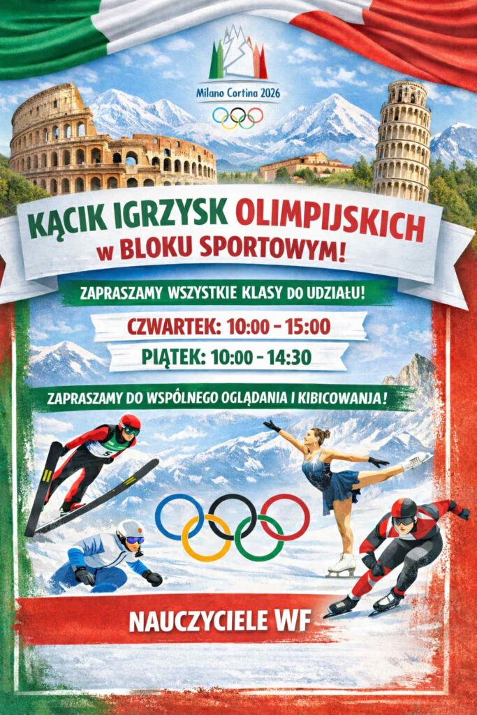 Uczniowie klas 1–8 z zainteresowaniem oglądają rywalizację podczas Zimowych Igrzysk Olimpijskich 2026 we Włoszech. To świetna okazja, by wspólnie przeżywać olimpijskie emocje, poznawać wartości fair play i rozmawiać o znaczeniu aktywności fizycznej w codziennym życiu.