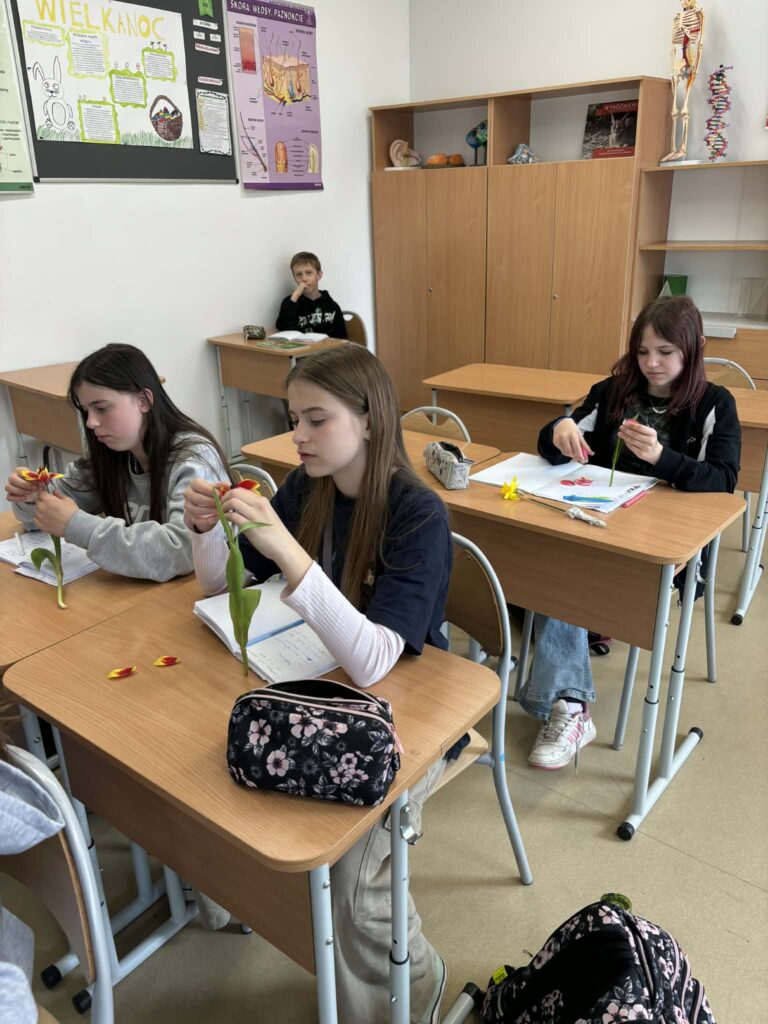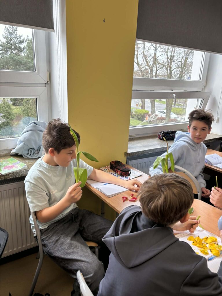 Podczas zajęć mieli okazję dokładnie przyjrzeć się jego poszczególnym elementom, takim jak płatki, pręciki czy słupek. Największą frajdą okazało się samodzielne „rozłożenie” kwiatu na części i obserwowanie ich z bliska.