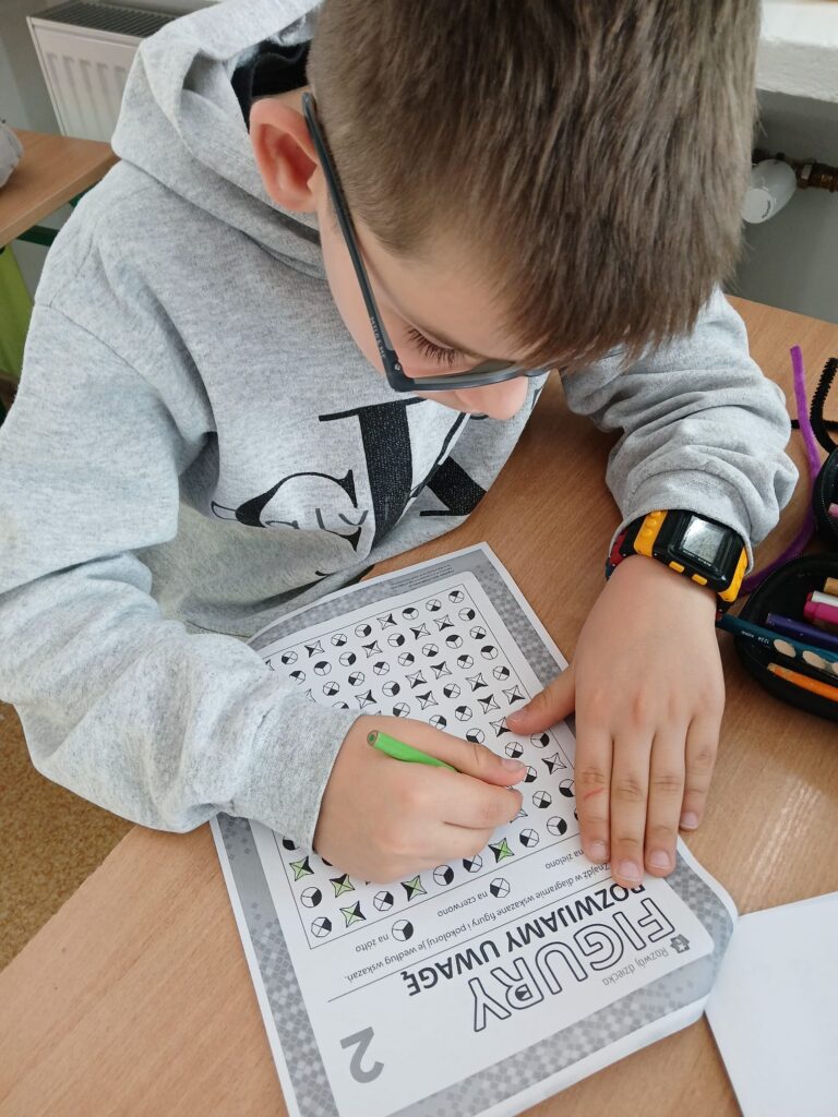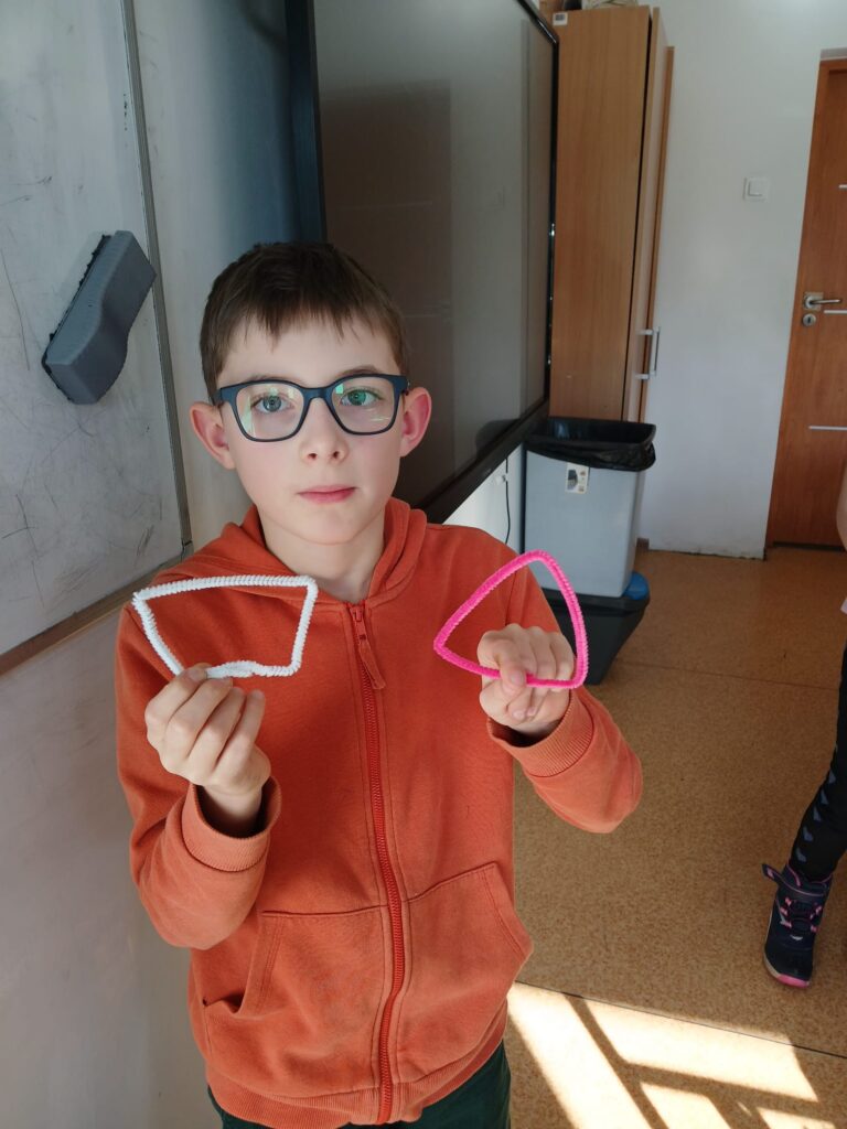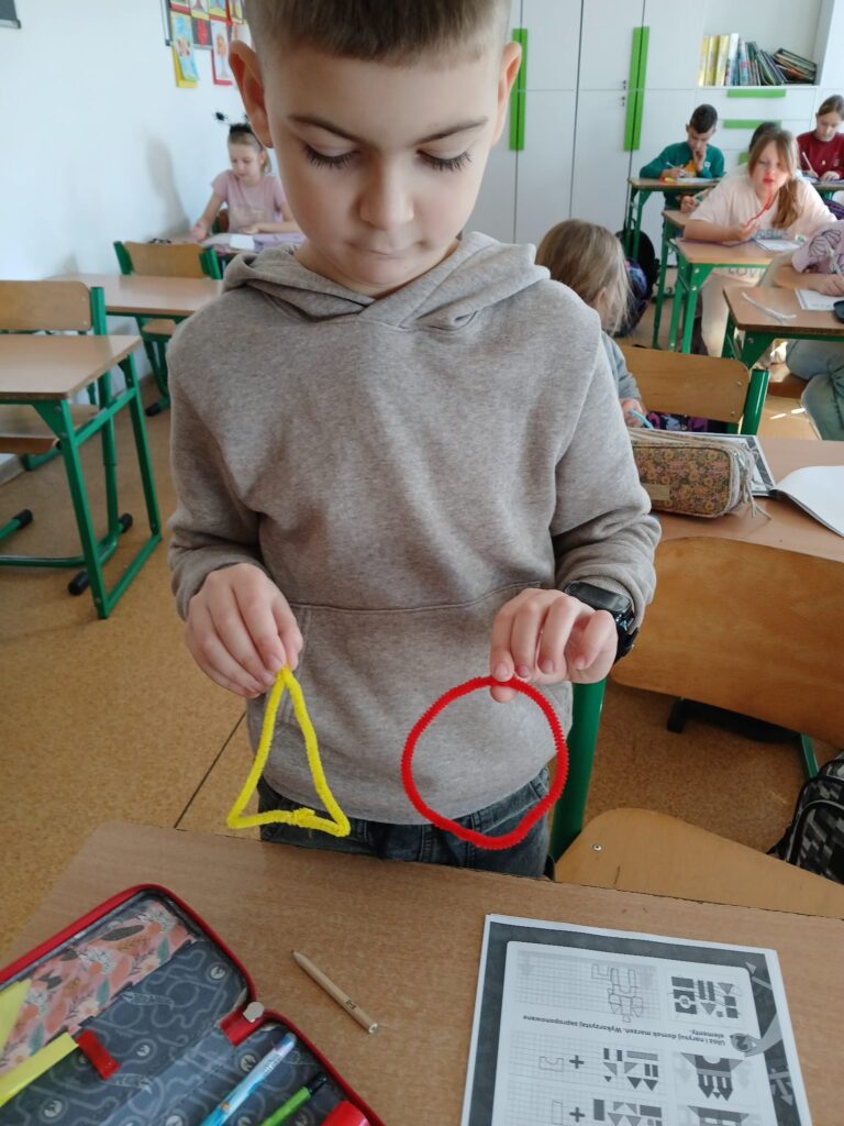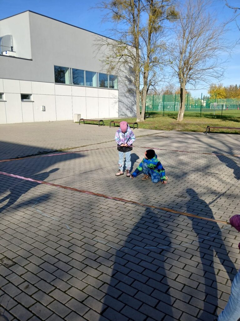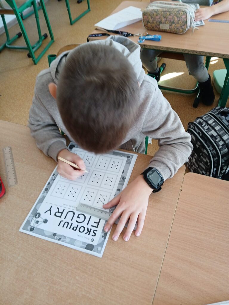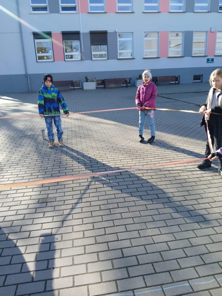 Uczniowie rozwiązywali zadania i łamigłówki, w których odnajdywali figury geometryczne. Na boisku szkolnym tworzyli z wstążek cienie figur, a następnie je odrysowywali. Wspólnie ustawiali się tak, aby tworzyć różne figury geometryczne, utrwalając ich nazwy i kształt w praktyczny sposób. Zajęcia rozwijały wyobraźnię przestrzenią, spostrzegawczość oraz umiejętność współpracy w grupie.