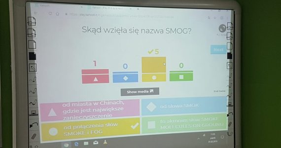 | Klasa Vc uczestniczyła w zajęciach dotyczących SMOGU w ramach projektu Edukacyjna Sieć Antysmogowa.Zdobytą w czasie zajęć wiedzę testowaliśmy w interaktywnym quizie KAHOOT. |