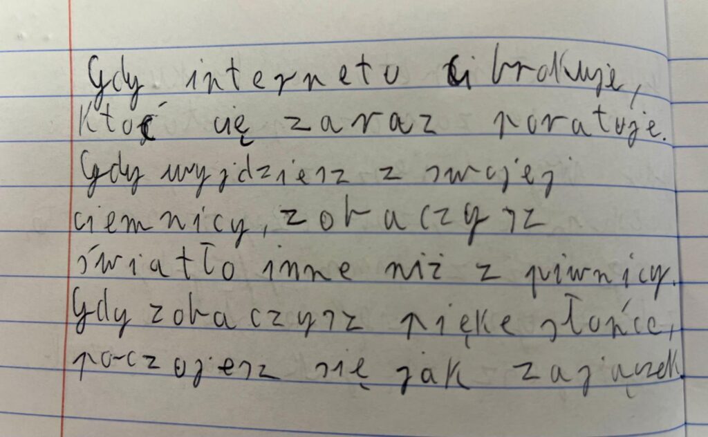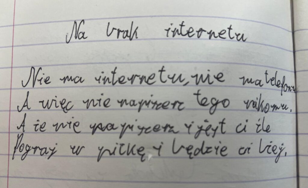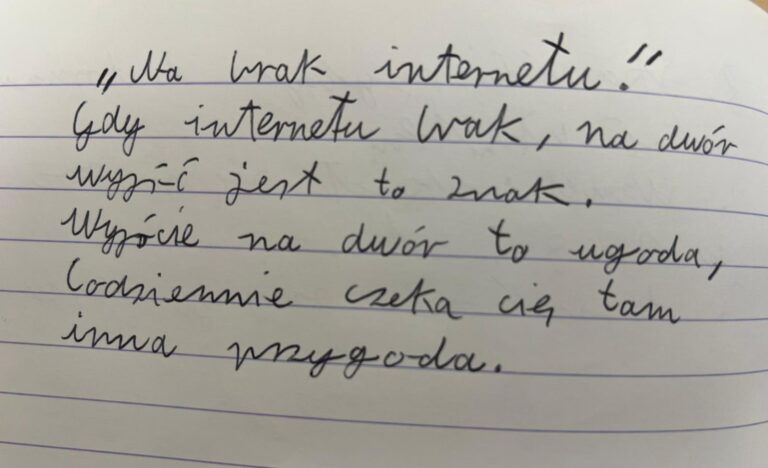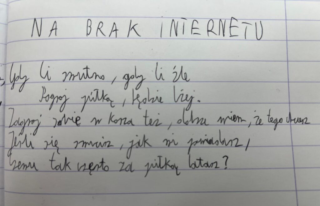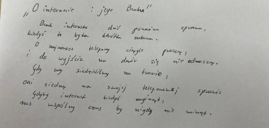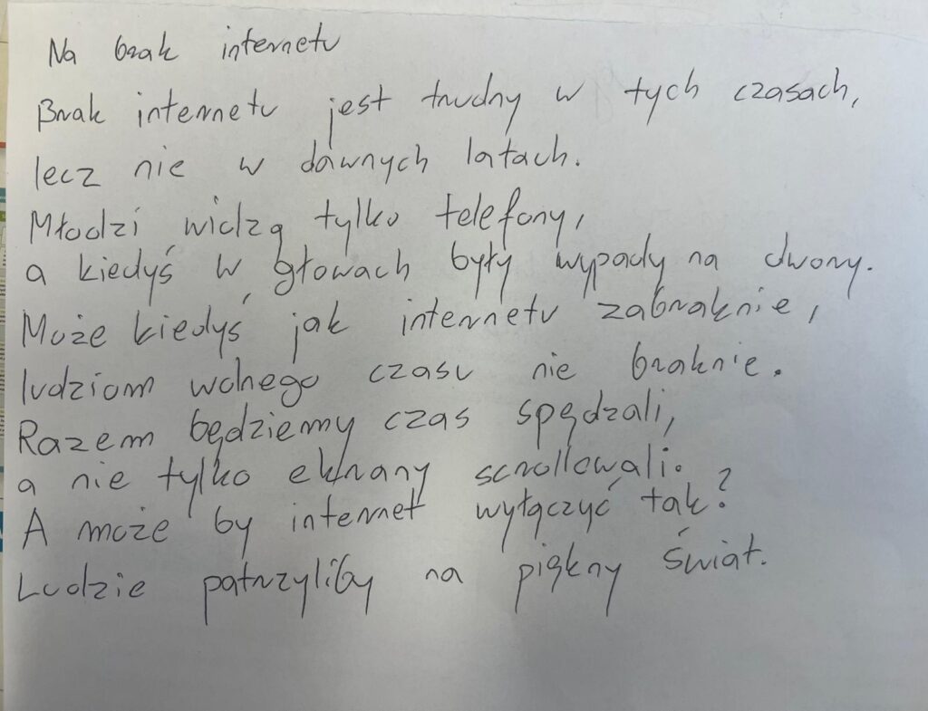 Uczniowie klasy VII b postanowili zmierzyć się z bardzo aktualnym tematem – uzależnieniem od Internetu. W krótkich, błyskotliwych fraszkach pokazali, że o poważnych sprawach można mówić z humorem i dystansem. Ich utwory mogą świetnie bawić. Przypominają, że warto zachować równowagę między światem online a prawdziwym życiem. Zachęcamy do lektury uczniowskich fraszek.