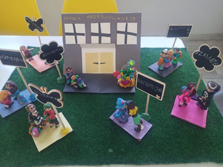 Uczennica klasy 1 A – Marlenka Wiśniewska wykonała pracę na konkurs SPEktakularna Szkoła. Jako zadanie konkursowe wybrała pracę plastyczną – wykonaną z plasteliny. Przedstawia ona dzieci na wózkach bawiące się wspólnie z dziećmi pełnosprawnymi, uczniów o różnym pochodzeniu etnicznym, uczniów o różnych poglądach – religijnych i innych. Praca wspiera wartości takie jak wzajemna współpraca, szacunek, akceptacja, pomoc, wsparcie, rozmowa, wysłuchanie. Zadanie zostało wykonane z pełnym zaangażowaniem i we współpracy. Praca zawiera detale , a jej wykonanie było czasochłonne i wymagało wiele trudu. Gratulujemy talentu i cieszymy się z wzięcia udziału w konkursie.
