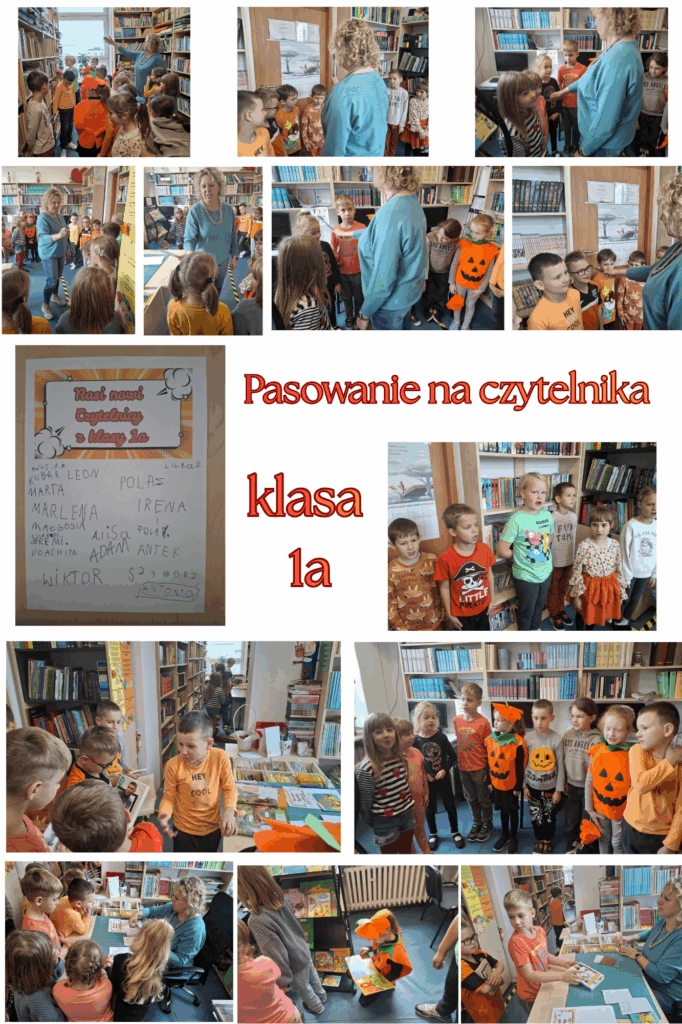 Uczniowie klasy 1a w ostatni piątek oficjalnie zostali czytelnikami naszej biblioteki. Zanim złożyli uroczyste przyrzeczenie, że będą dobrymi czytelnikami szanującymi książki i zostali uroczyście pasowani na czytelnika, poznali zasady korzystania z biblioteki. Bardzo szczegółowo opowiedzieli w jaki sposób należy traktować książki, a także zachować się kulturalnie w bibliotece. Pierwszoklasiści własnoręcznie potwierdzili, że weszli do grona naszych czytelników. Na koniec wypożyczyli swoje pierwsze książki. W wyborze pomogła im w tym wystawka książek pt. „Zaczytane pierwszaki – mądre dzieciaki”, przygotowana specjalnie dla nich.