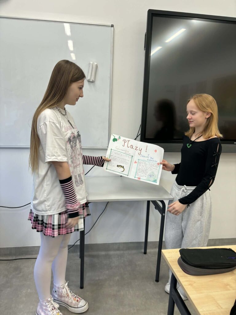 Uczniowie pracowali w parach, przygotowując plakaty lub prezentacje, w których przedstawili informacje o płazach.