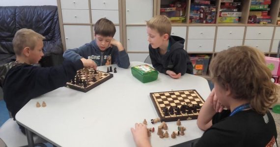| W ramach projektu „Starszak-Maluchowi” Jędrek z klasy 5a uczy dzieci gry w szachy, rozwiązuje z nimi łamigłówki i zadania oraz gra w gry planszowe. |