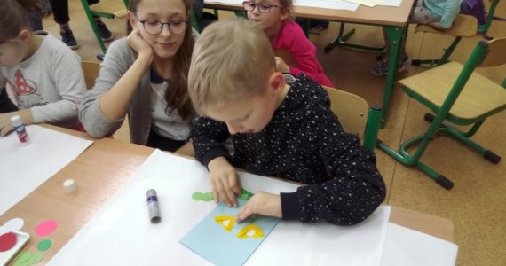 | Szkolni wolontariusze dołączyli do programu „Starszak maluchowi”. Przez cały marzec prowadzą zajęcia plastyczne – zwiastuny wiosny z kółek origami – w klasach 1-3. |