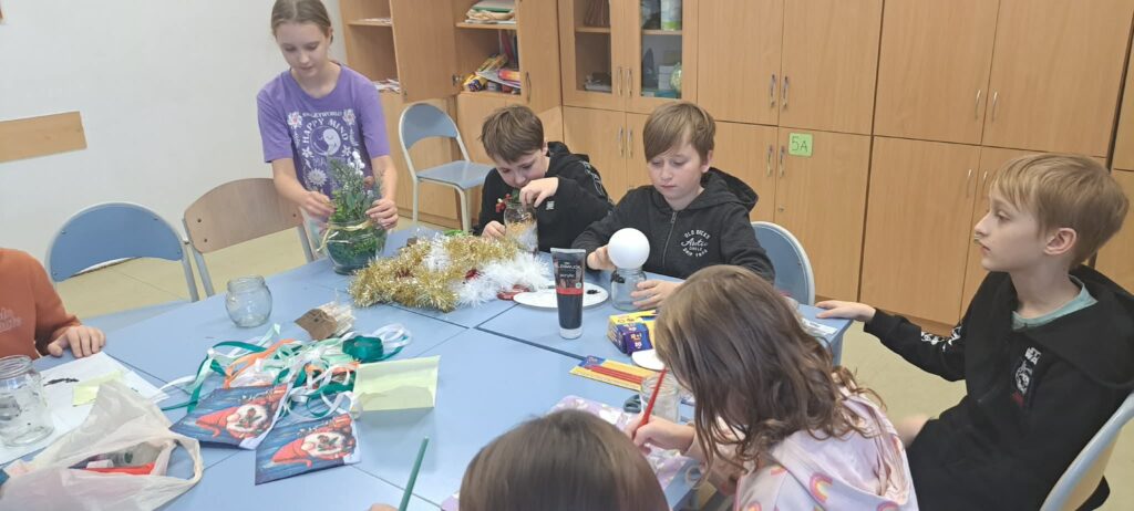 Uczniowie klasy 4a podczas lekcji plastyki wykonali piękne stroiki świąteczne. Zajęcia odbyły się dzięki współpracy szkoły z Radą Osiedla, która wsparła inicjatywę, przekazując niezbędne materiały.