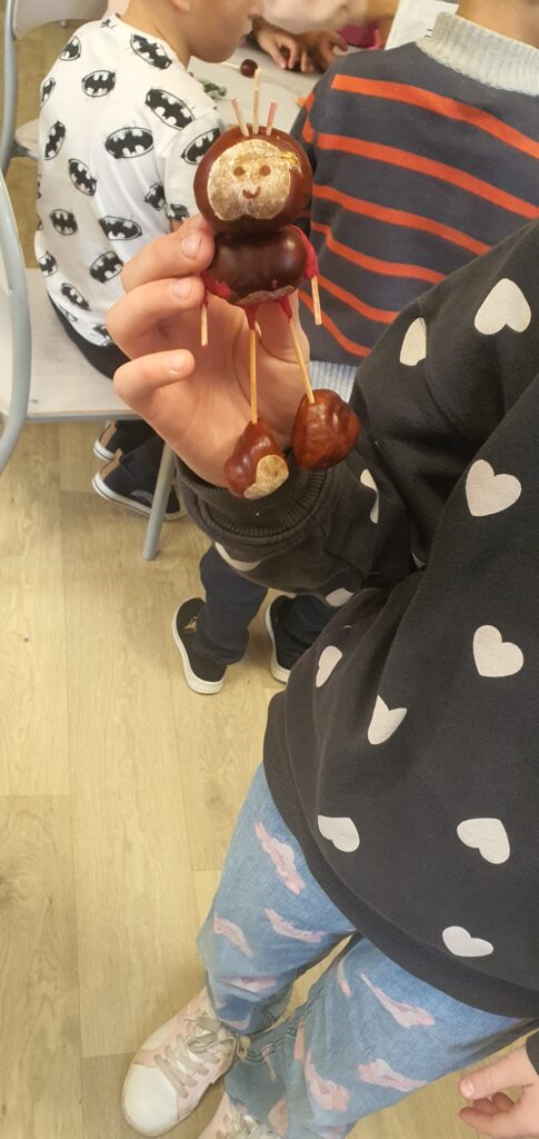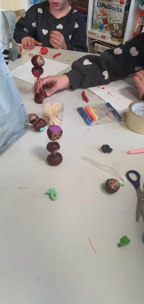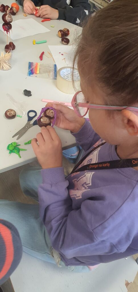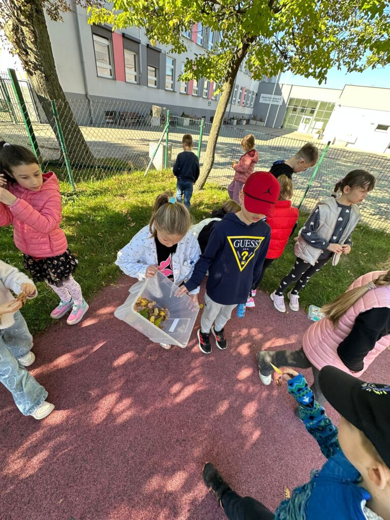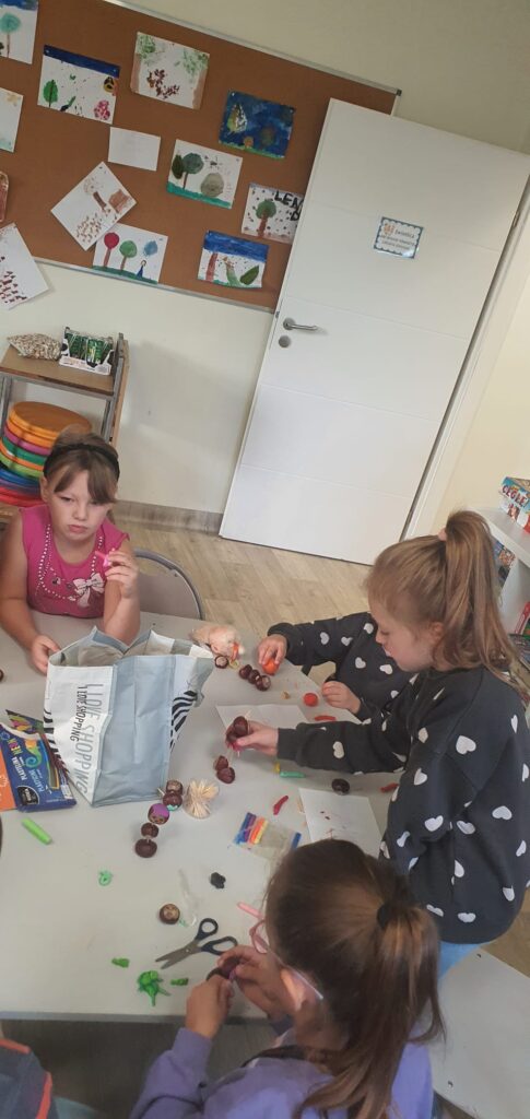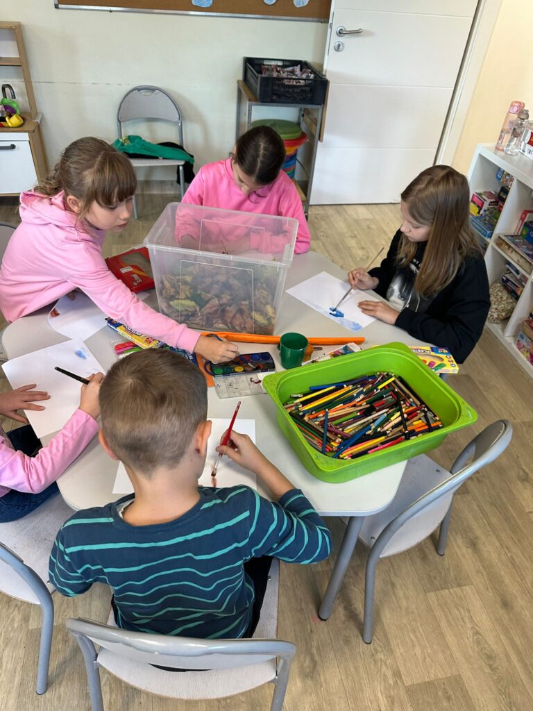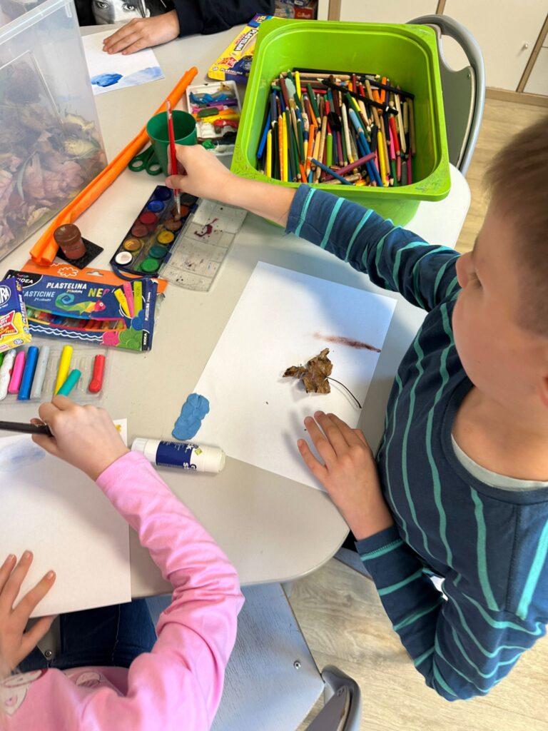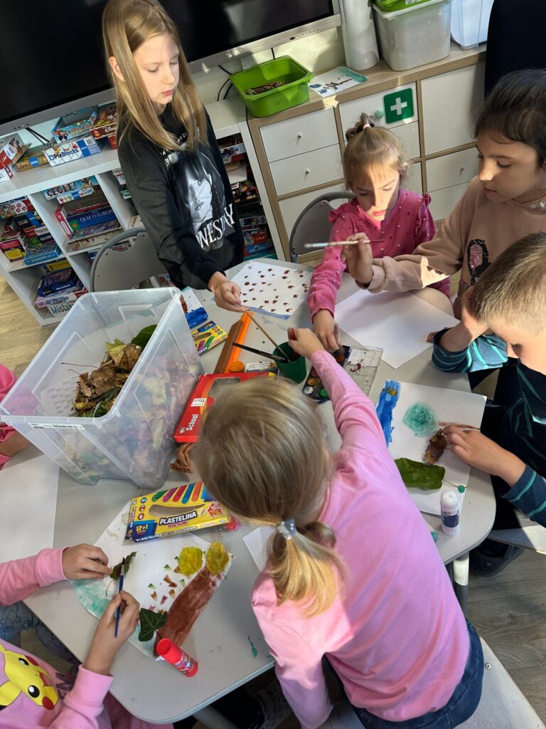 W tym tygodniu w świetlicy szkolnej dzieci wspólnie zebrały liście na terenie szkoły, ciesząc się jesienną aurą i współpracą w grupie. Następnie wykorzystały zebrane skarby do twórczej pracy plastyczno-sensorycznej. Z pomocą plasteliny, farb i naturalnych liści tworzyły ciekawe kompozycje, rozwijając jednocześnie swoją wyobraźnię i kreatywność. Dzięki tej aktywności ćwiczyły również motorykę małą – ugniatając, malując i łącząc różne materiały.