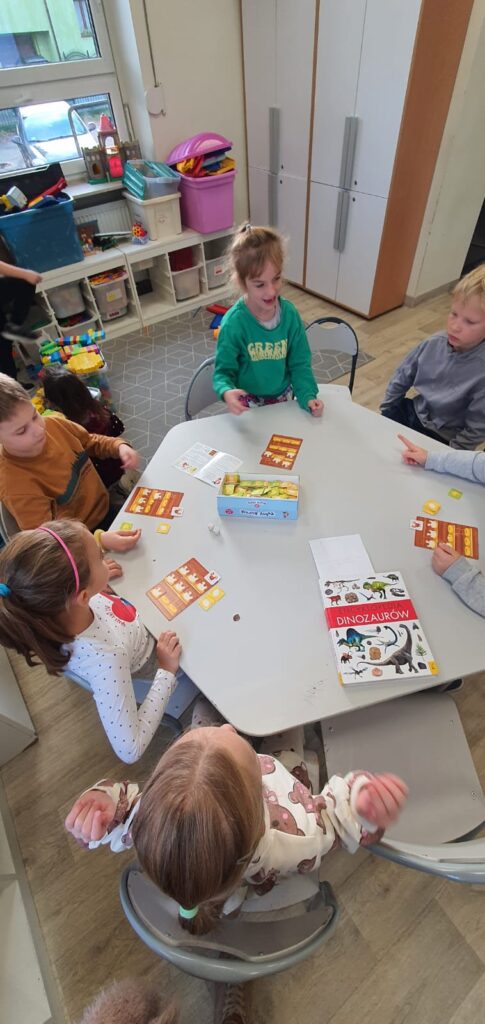 Gry planszowe – dzieci chętnie współpracowały, rozwijały swoje umiejętności społeczne i logiczne. Uczyły się także kulturalnego zachowania podczas zabawy.
