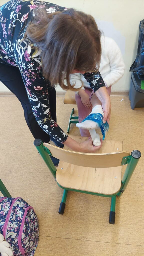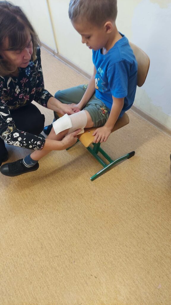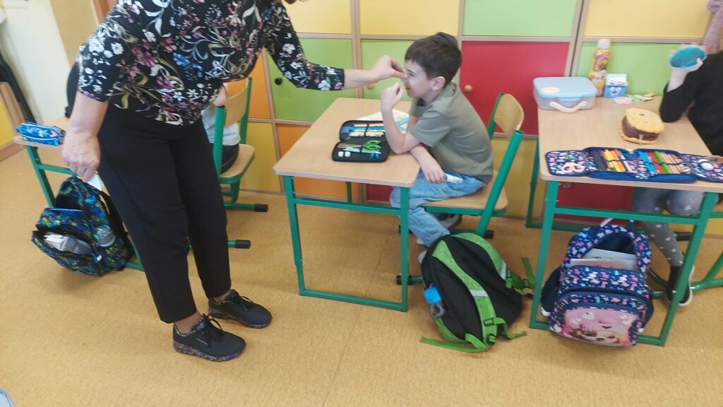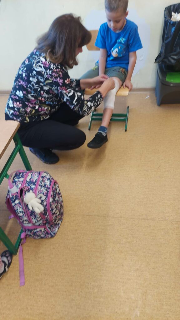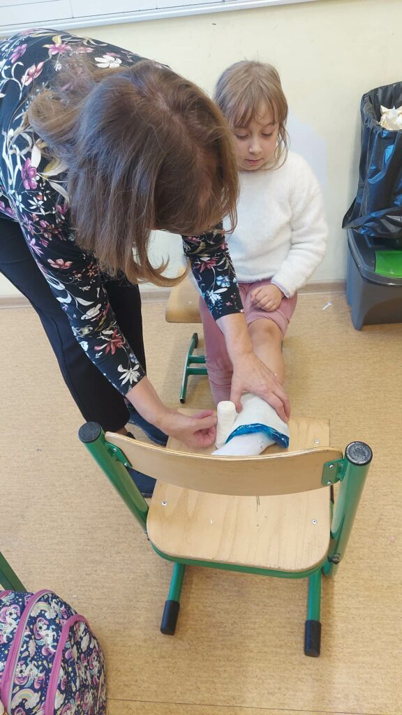 Klasa 1a realizuje projekt „Planeta zdrowia” w ramach Uniwersytetu Dzieci. W ramach projektu uczniowie mieli zajęcia praktyczne dotyczące pierwszej pomocy z pielęgniarką pediatryczną, babcią Irenki. Dzieci uczyły się jak należy postępować przy stłuczeniach, skaleczeniach, krwotoku z nosa i skręceniach.
